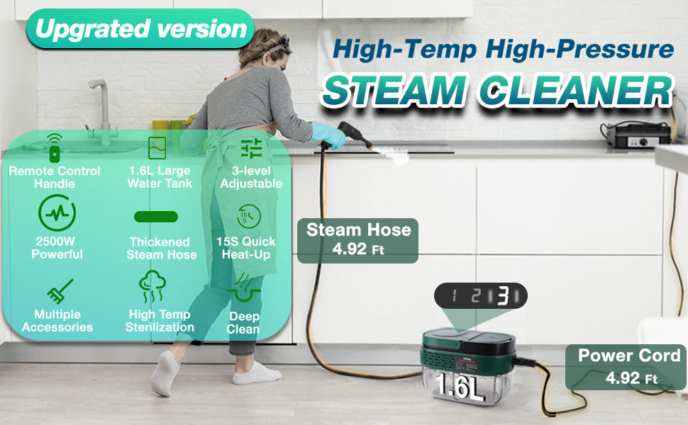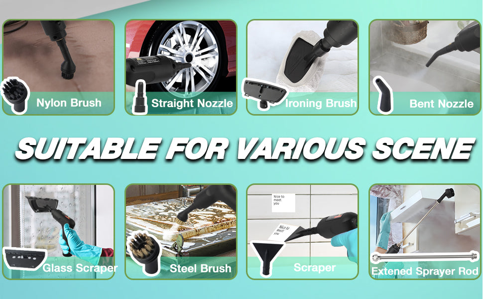 - Multiple brushes, a thickened 4.92ft hose, extension rod, and included gloves let you tackle floors, furniture, windows, and car interiors without chemicals.