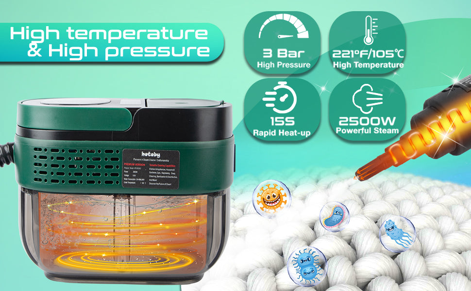 - It heats up in just 15 seconds to 221°F (105°C) at 3BAR with 2500W of power, effectively removing stubborn dirt while staying lightweight and easy to carry.