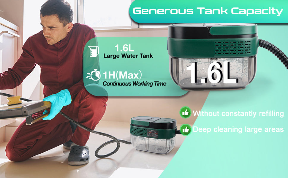 - A 1.6L tank offers longer cleaning without frequent refills.