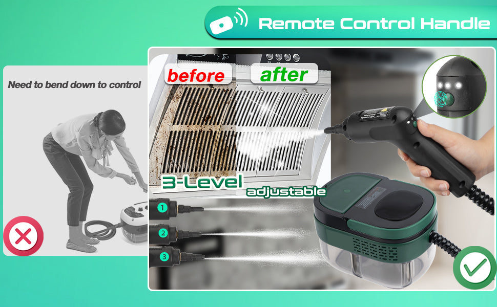 - This steam cleaner features a convenient remote-control handle with three adjustable steam levels—no more bending or constant repositioning.